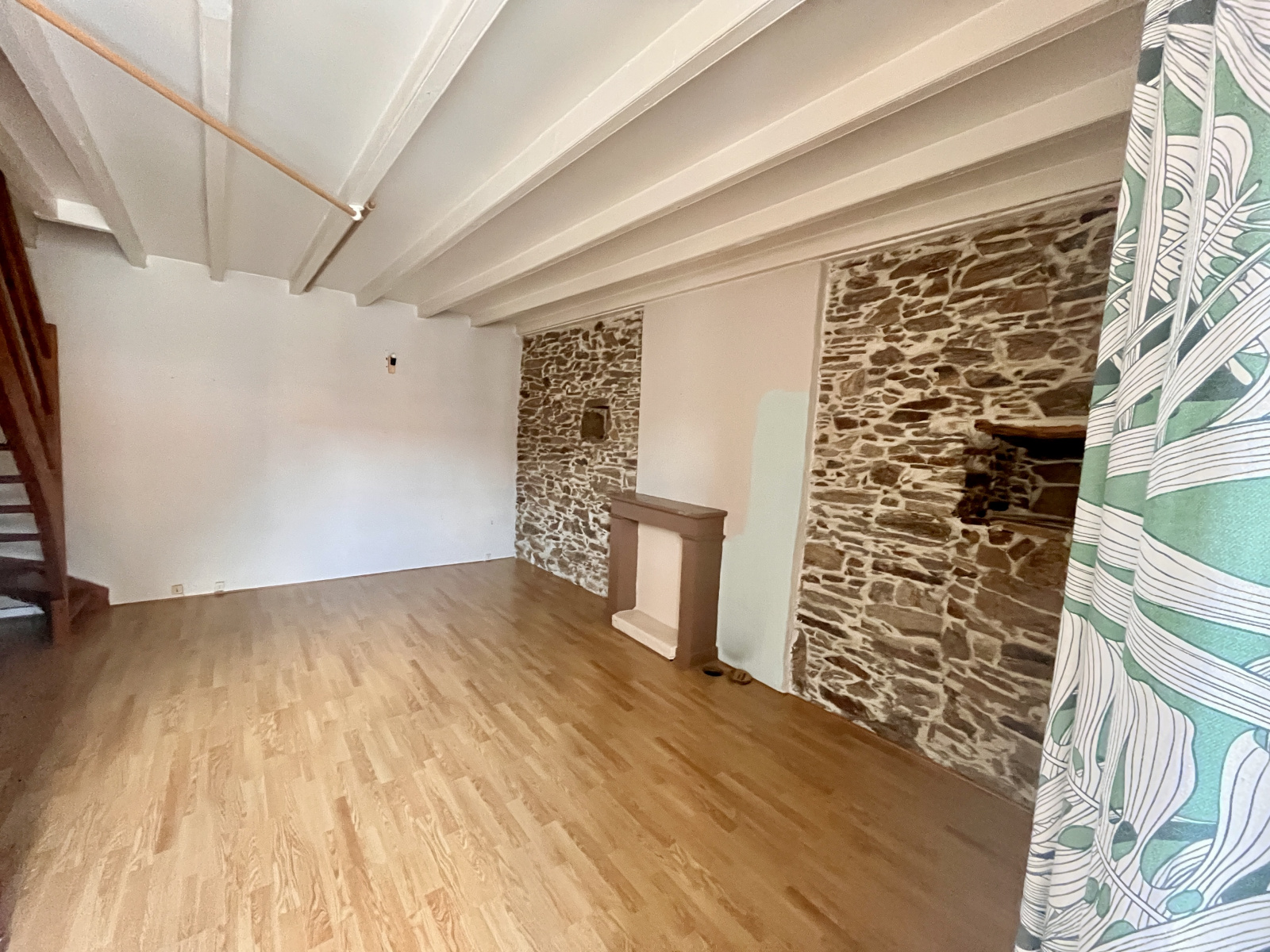 Un escalier en bois dessert un 1er niveau avec une chambre de 23 m².