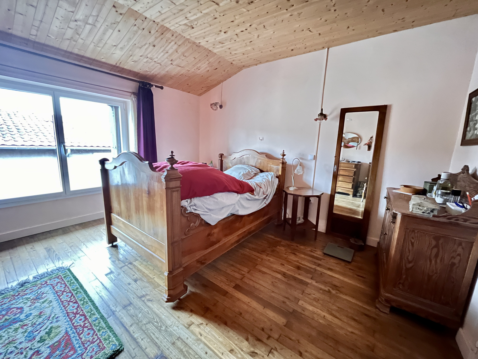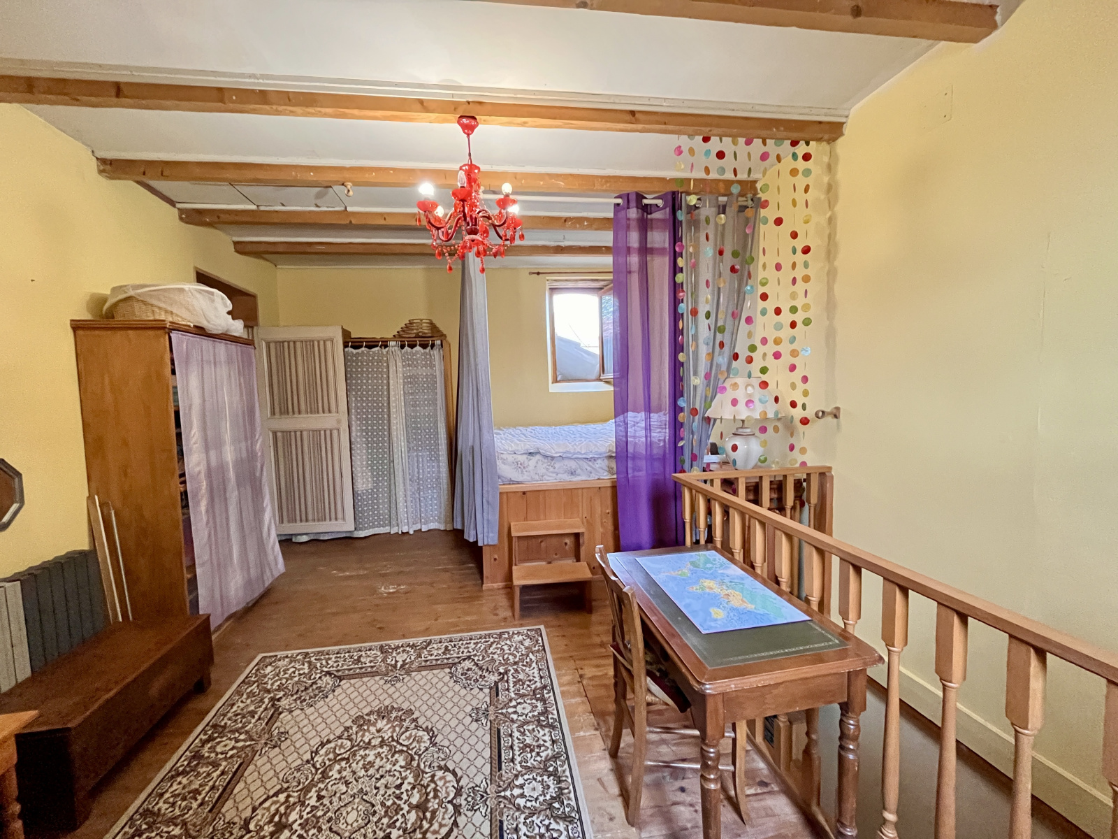 A l'etage : Un bureau, une chambre de 15 m², une salle de bain et une grande chambre de 40 m² avec poutres apparentes donnant sur un toit terrasse. Une autre chambre de 21 m² avec accès sur un grenier pouvant être aménagé en pièce habitable supplémentaire.
