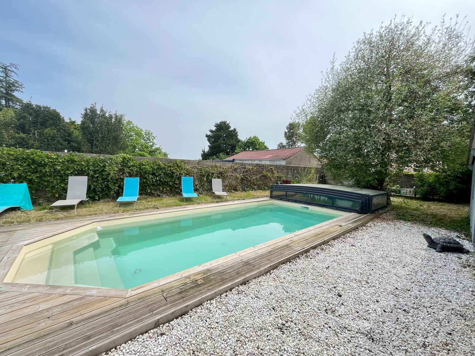 Grand garage de 42 m² avec atelier et préau. Jardin avec puits - une piscine équipée d'une pompe à chaleur et d'un dôme.