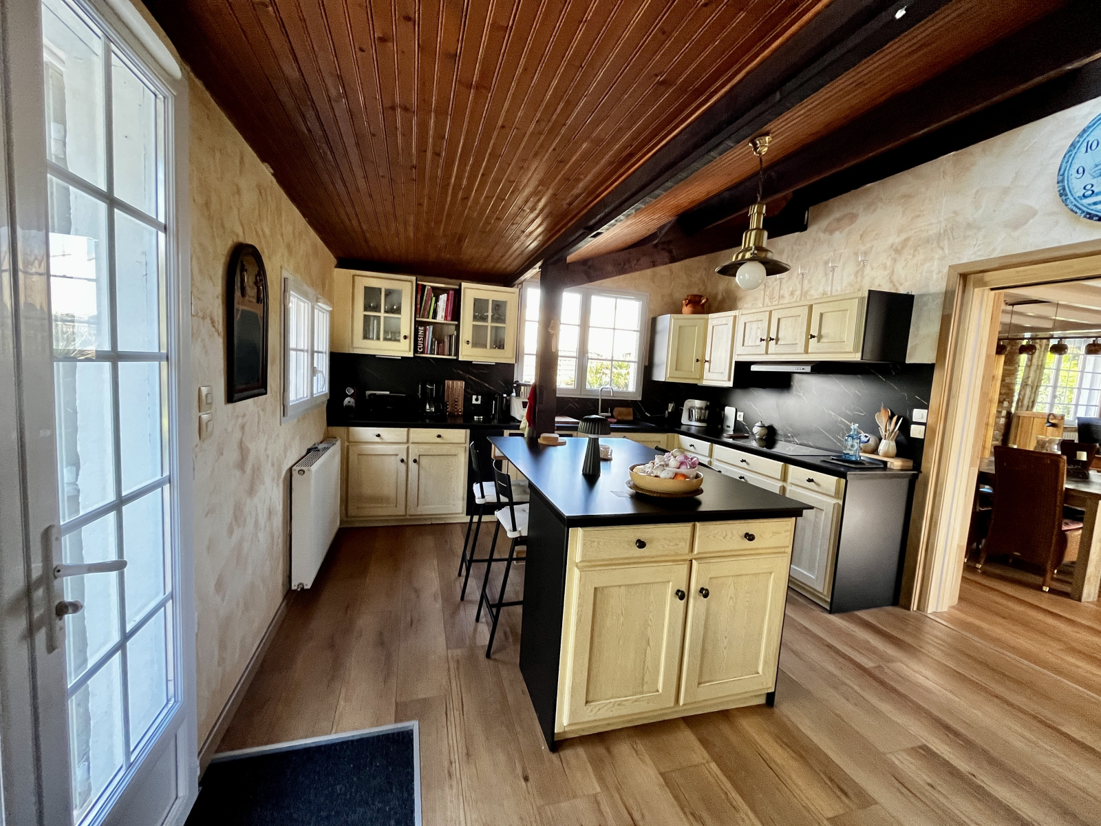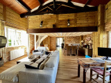 Cette maison se compose d'une cuisine récente entièrement aménagée et équipée ouverte sur un magnifique salon-séjour avec une belle hauteur de plafond et équipé d'un poêle à pellets.