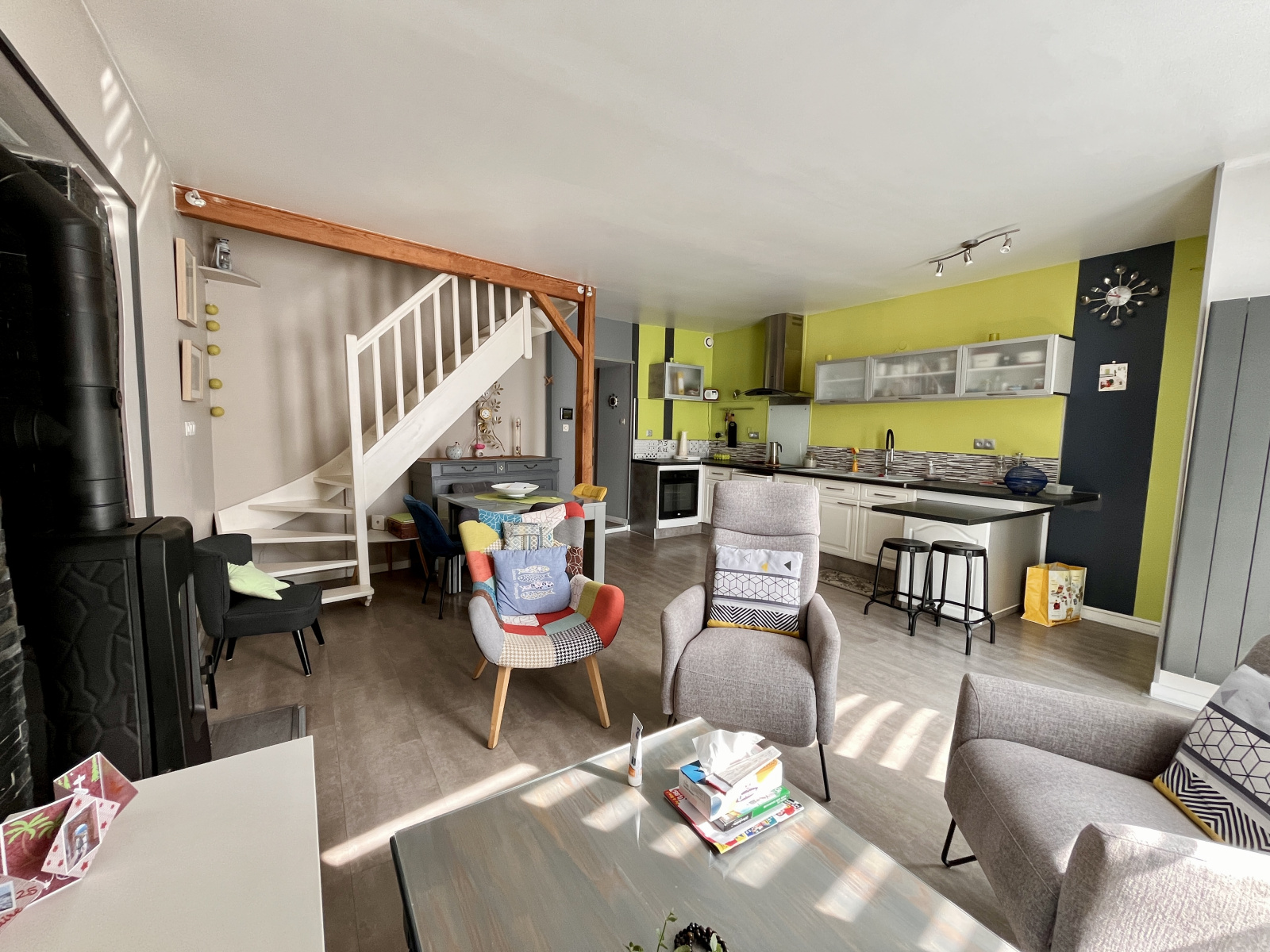 D'une lumineuse pièce de vie de 30 m² comprenant une cuisine aménagée et équipée et un salon séjour avec un poêle à bois.