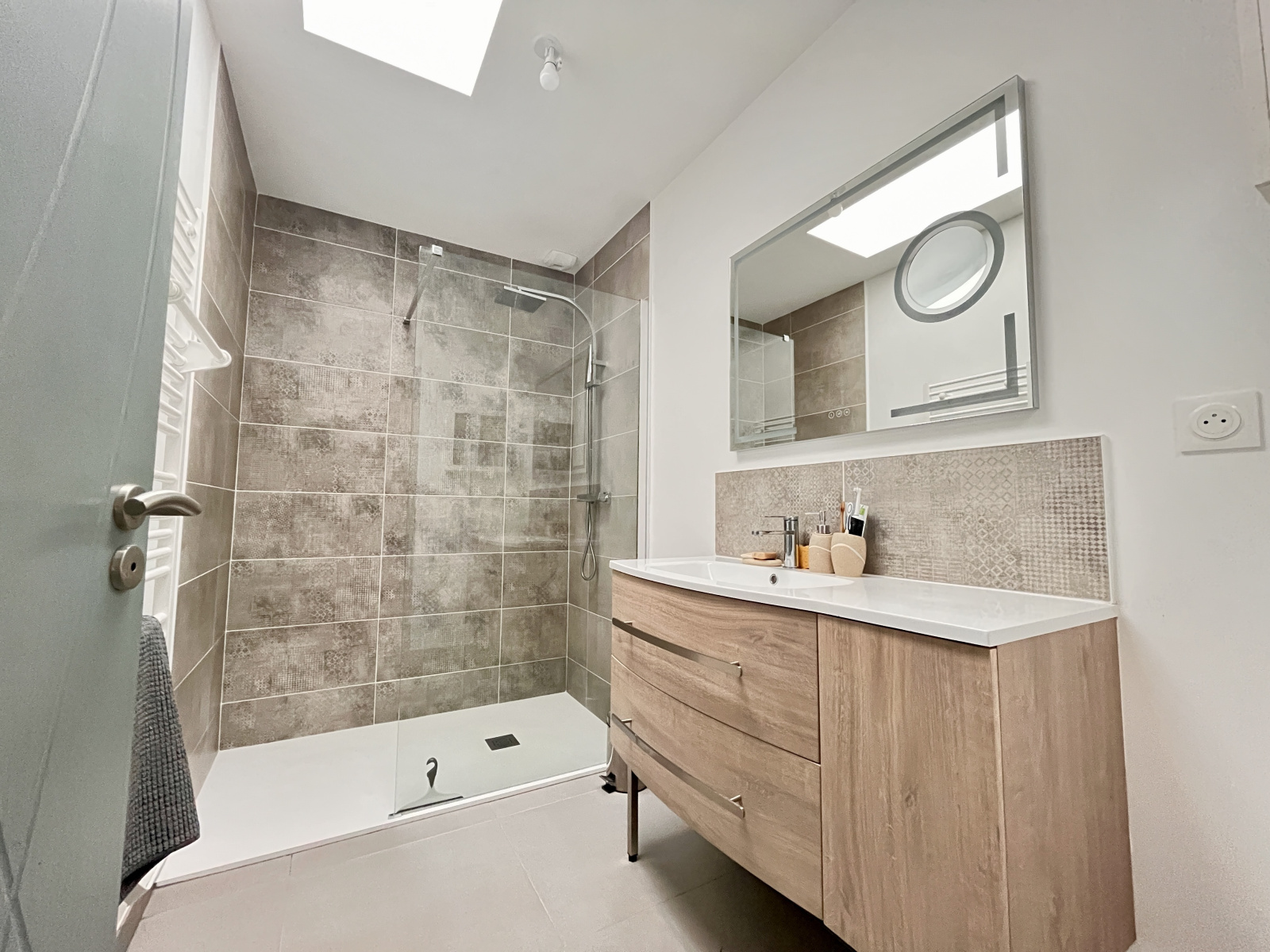 Un dégagement desservant un cellier buanderie - des toilettes séparées - une salle d'eau avec douche italienne - trois belles chambres avec sol parquet dont deux avec placards.